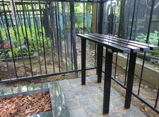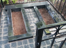 После покраски ограды устанавливаем подставку под памятники с цветниками, лавочку и укладываем пол гранитной брусчаткой.