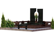 Двойной мемориальный комплекс. Классические формы. Максимальное покрытие участка гранитом. Здесь есть все необходимые элементы: надгробные плиты, цветники, ваза, лавочка, ограда. Хорошо сочетаются два сорта гранита – красный и черный. Данный комплекс использует хорошее решение для выделения значимости центральной зоны – поднятие уровня. Очень сильный ход, используется часто, не всегда осознается. Работает безотказно.