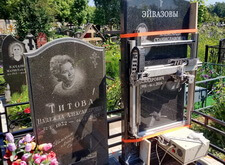 Далее мы привозим на могилу гравировальный станок, укрепляем его на памятник, наносим предварительно согласованные с клиентом портреты.